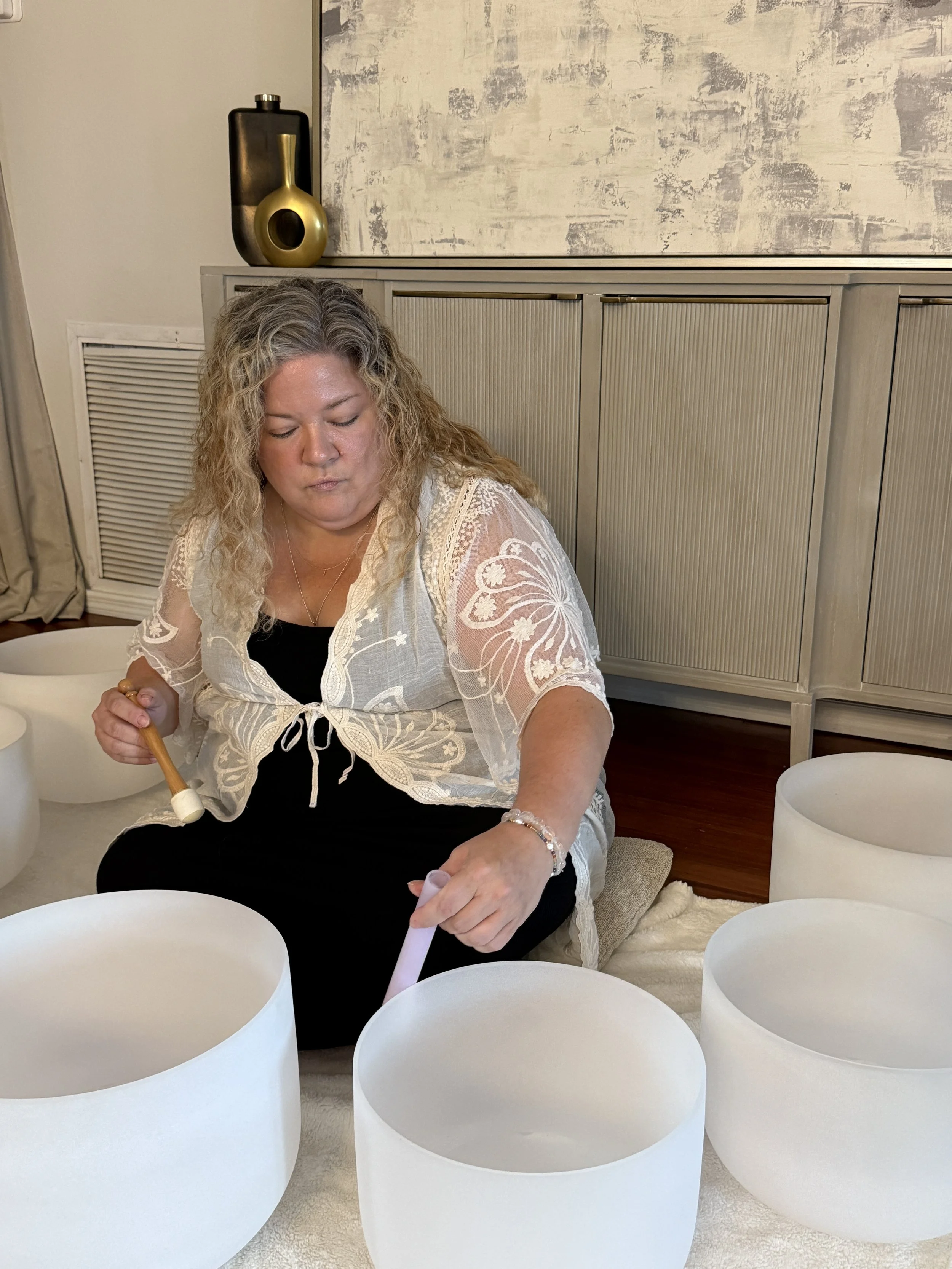 A deeply personal journey designed to meet you where you are. Each 60-minute session begins with grounding and intention setting, followed by a tailored sound immersion using chakra-aligned crystal bowls, tuning forks, and chimes.